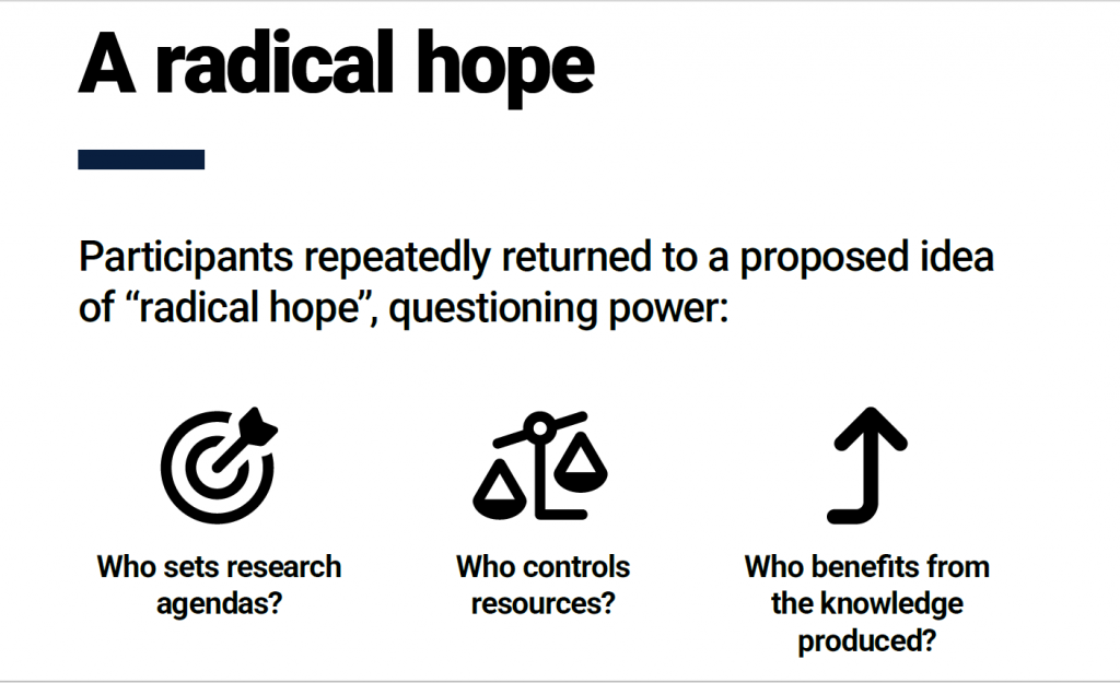 “Participants emphasised the need to ground different types of research in deep reciprocity and respect for communities to ensure research is collaborative rather than extractive. Rather than being filtered or interpreted through externally designed frameworks and language alien to communities and their deeply held cultural knowledge, community-rooted research draws on the knowledge and voices of local people, and is already changing narratives and influencing policy, from local to national.”